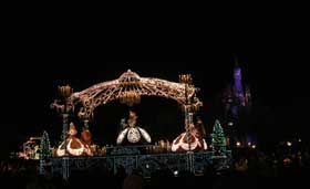 続いて、汽車に引かれる輝くコスチュームにはミッキー、ミニーがいる。 「ミッキーのドリームライツ・トレイン」 ![]() ●2.Aliee in Wonderland ふしぎの国のアリス アリスの世界に登場するユニークでカラフルな動物