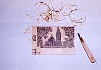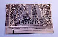 ![]() 3.木版画を刷る。 ・インクを版木に塗る インクはあまり付け過ぎない事 ・ハガキを置く ・バレンで刷る 直接、表面を刷ると汚れる場合がある。 表面を刷る時はトレーシングペーパーを上に敷いてバレンを刷る トレーシングペーパーは表(すべる側)にする こうすれば、汚れないし、滑りやすい ・ハガキを取って完成